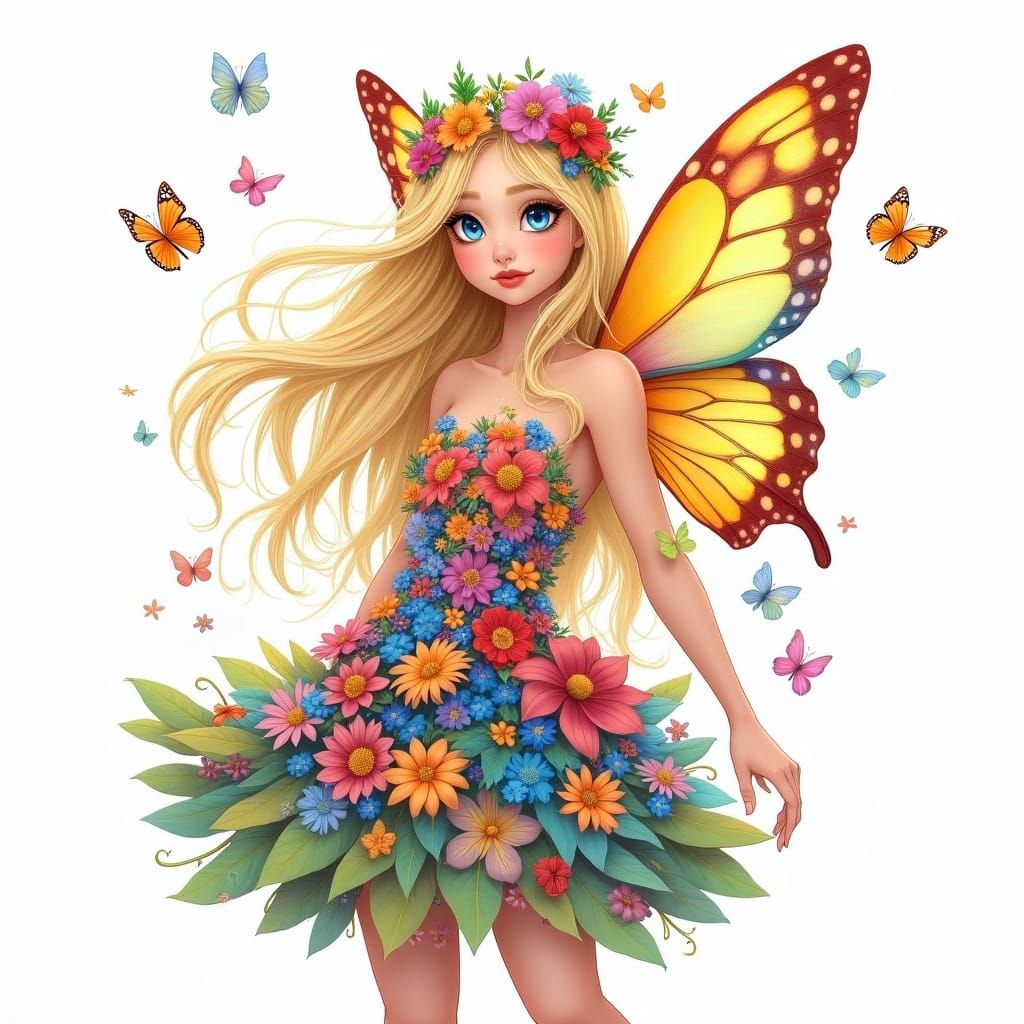 This painterly illustration depicts a delicate flower fairy with flowing blonde hair and a dress of petals. She has iridescent butterfly wings, with butterflies fluttering around her. Rendered in a dreamlike fantasy style.