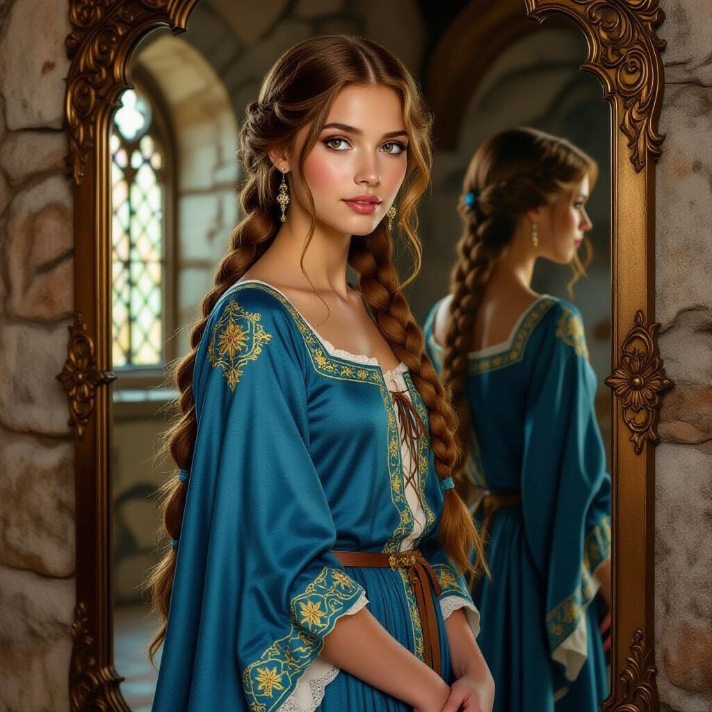 A striking picture of a medieval woman with long braided hair, wearing a flowing blue dress with gold embroidery. The scene evokes art nouveau style.