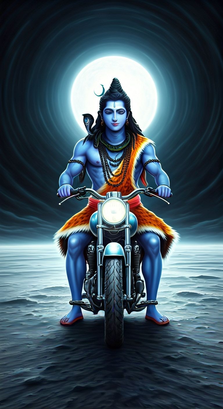 This image shows Lord Shiva riding a futuristic motorcycle on the moon. The scene is filled with swirling mist and hyperdetailed textures, rendered in a luminescent, ethereal fantasy style.