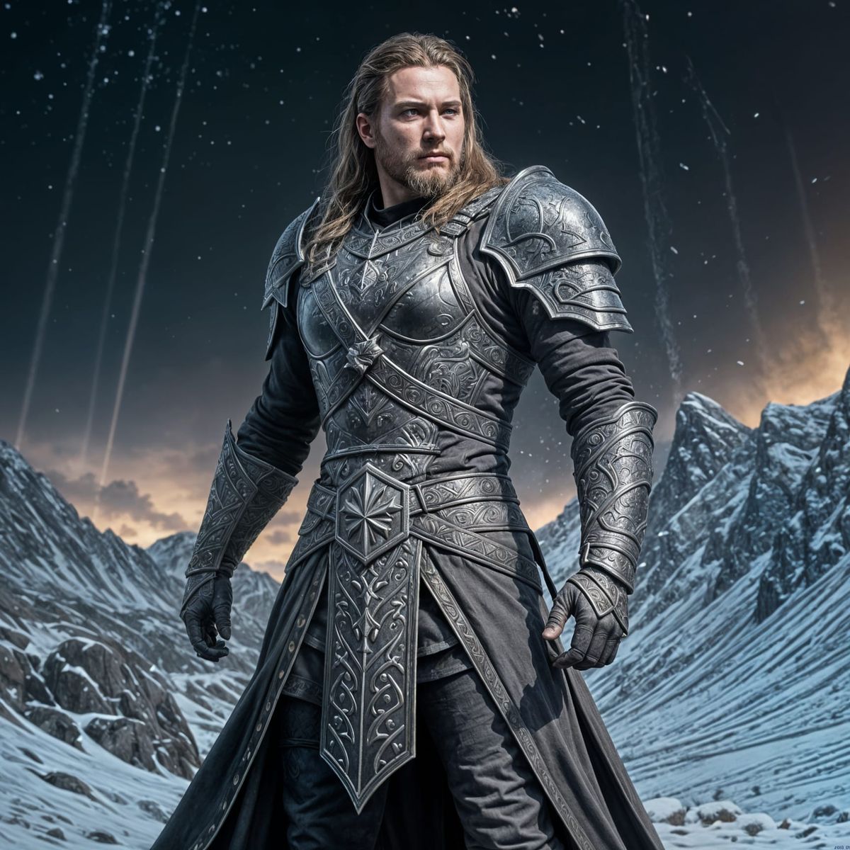 high fantasy epic male viking templar warrior, dark chainmail armor, battle stance, scenic winter background, high detail, high quality, correct anatomy, 8k resolution concept art portrait by Greg Rutkowski, Artgerm, WLOP, Alphonse Mucha dynamic lighting hyperdetailed intricately detailed Splash art ...