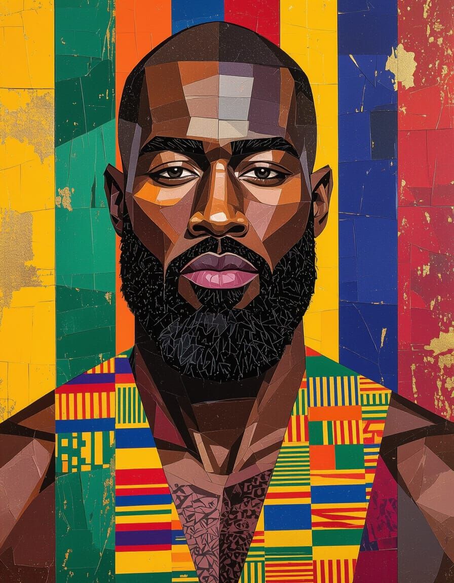 This mixed-media collage portrait features a muscular Black man with a beard, composed of colorful paper strips and Kente cloth. Features textured paper, watercolor, and gold leaf.
