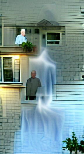 This image shows a melancholic portrait of a forgotten neighbor's spirit. A poignant representation of nostalgia and loss, captured in a somber digital art style.