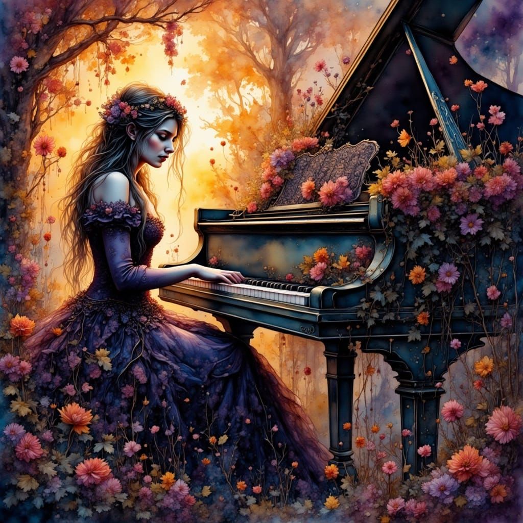 This image depicts a somber piano within a gothic Victorian manor, bathed in the warm light of an autumn sunset. Rendered in a watercolor style.
