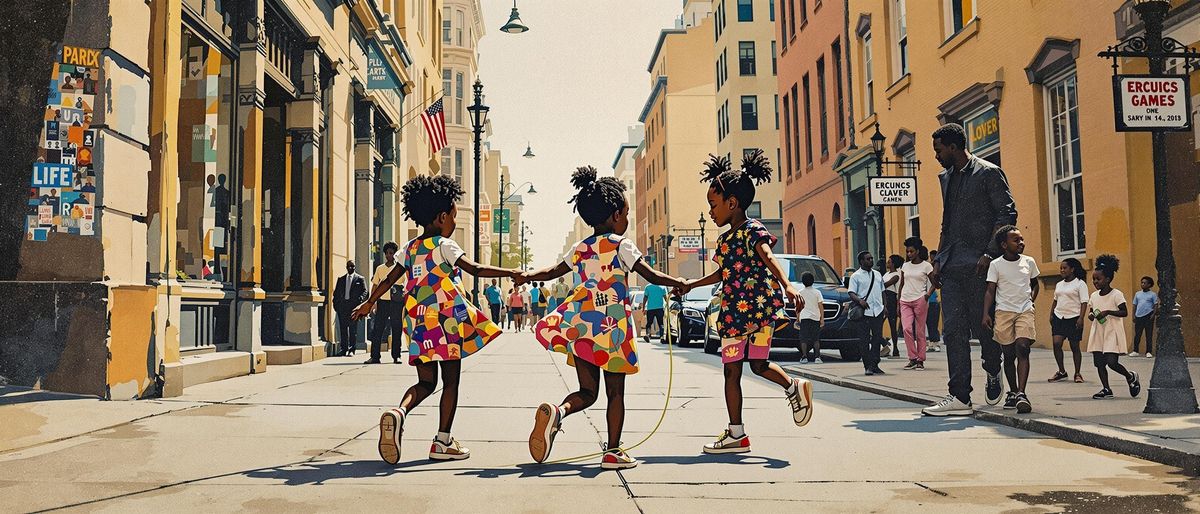 This image shows three African-American children skipping rope in a city. The urban scene is depicted in a collage style with muted vintage tones, conveying community and childhood play.