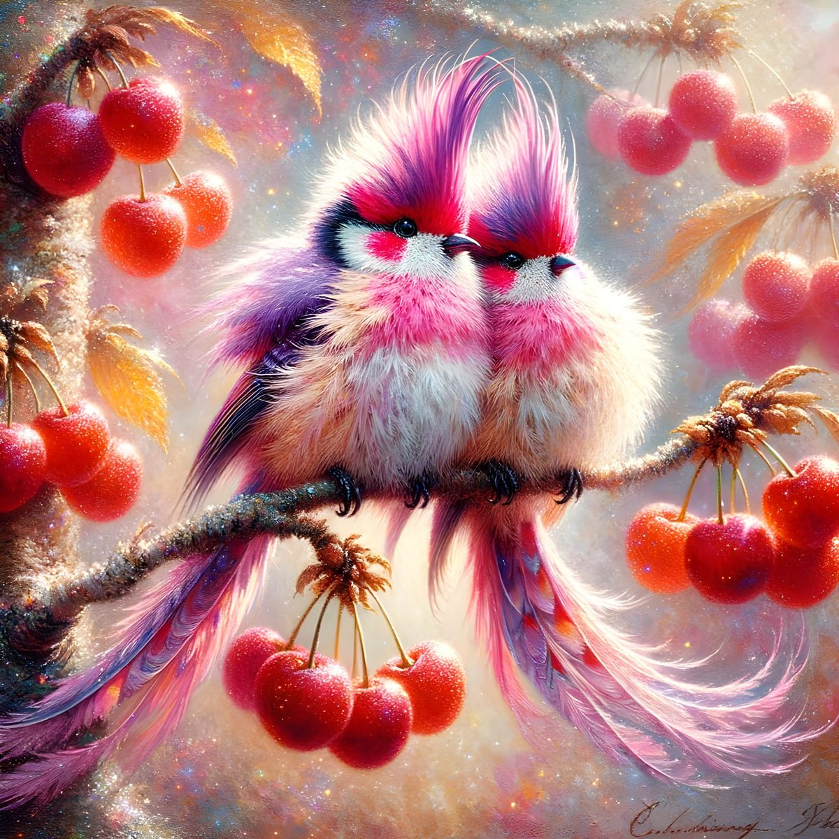 In an impressionist style painting, reminiscent of art before 1912 characterized by fine brushstrokes and a smudging technique synonymous with sfumato, two pink and purple crested birds are seen cuddling with their tails fluffed. They sit on a tree laden with bright red shining cherries, the cherries ...