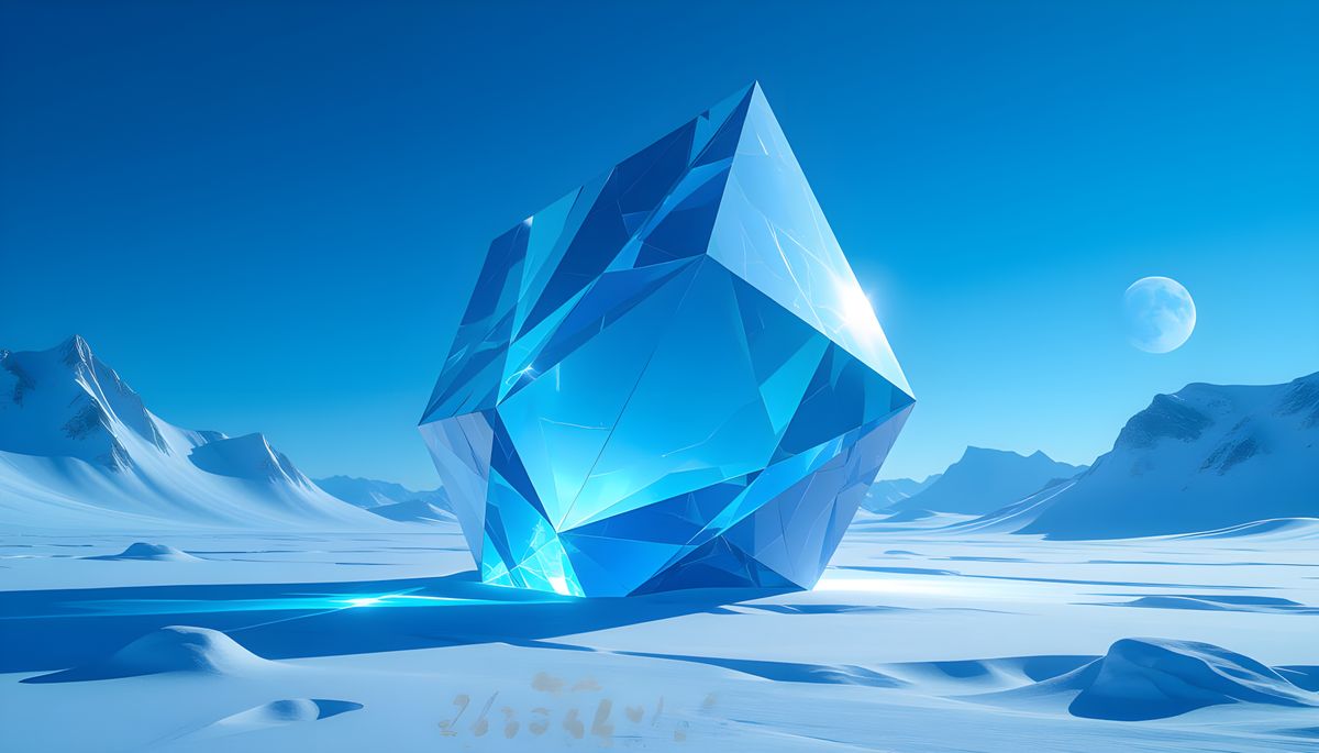 In a surreal, dreamlike winter landscape bathed in cold blue, ethereal light, an intricate, gigantic abstract sculpture of a three-dimensional prism dominates the horizon. The edges and surfaces are meticulously defined by straight swirling lines, creating a mesmerizing depth of field. Volumetric lighting ...