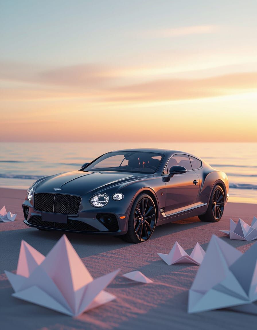 A dark Bentley car sits on a serene seashore, bathed in the warm light of a pastel sunset. The scene blends papercraft details with dreamy, ethereal stationery-inspired elements.