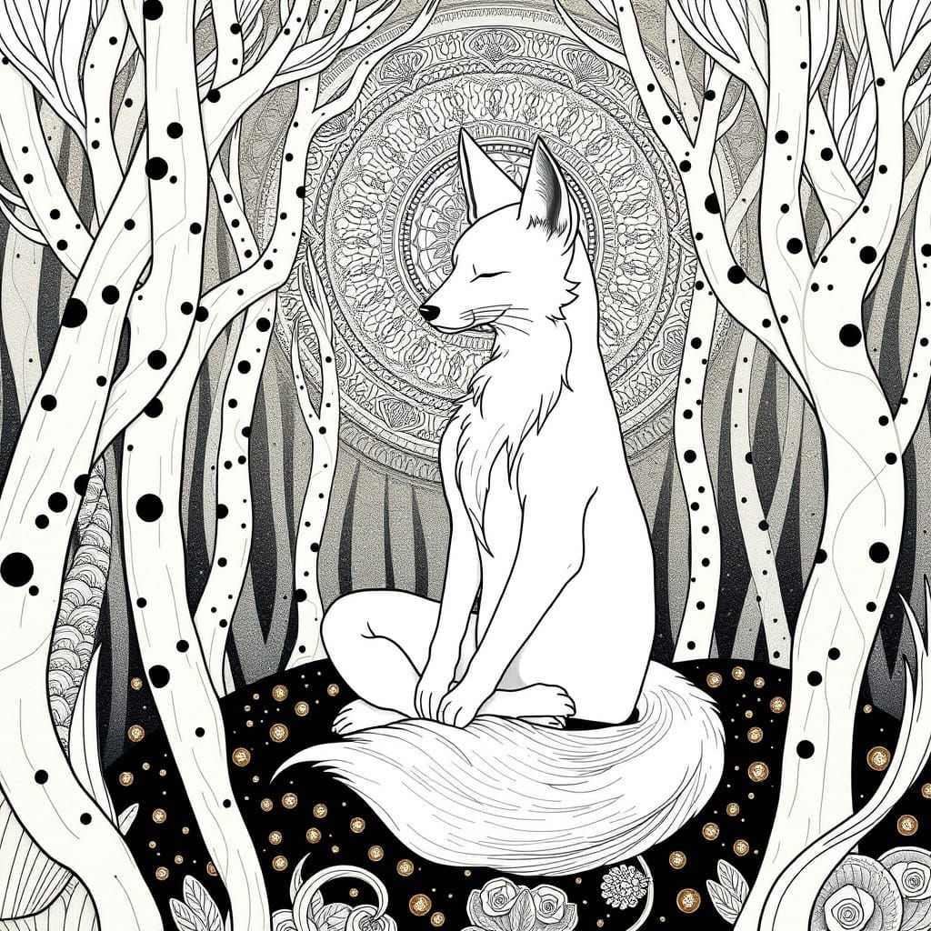 A striking picture of a white kitsune fox in meditation. The artwork features intricate zentangle patterns and is set in an art nouveau forest with flowing, organic lines.