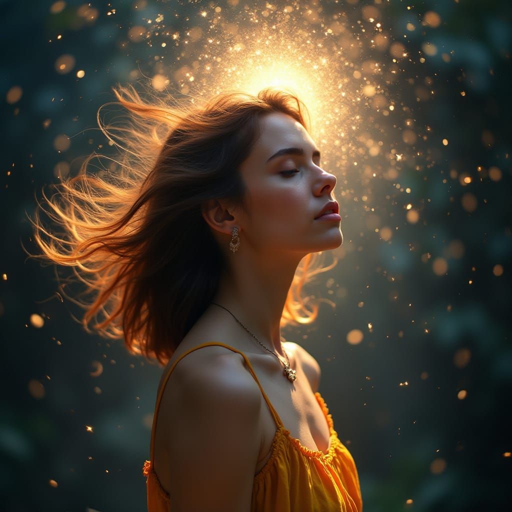 This image shows a woman with flowing hair, illuminated by a warm golden light, set against a starry celestial backdrop, creating a serene and spiritual atmosphere.