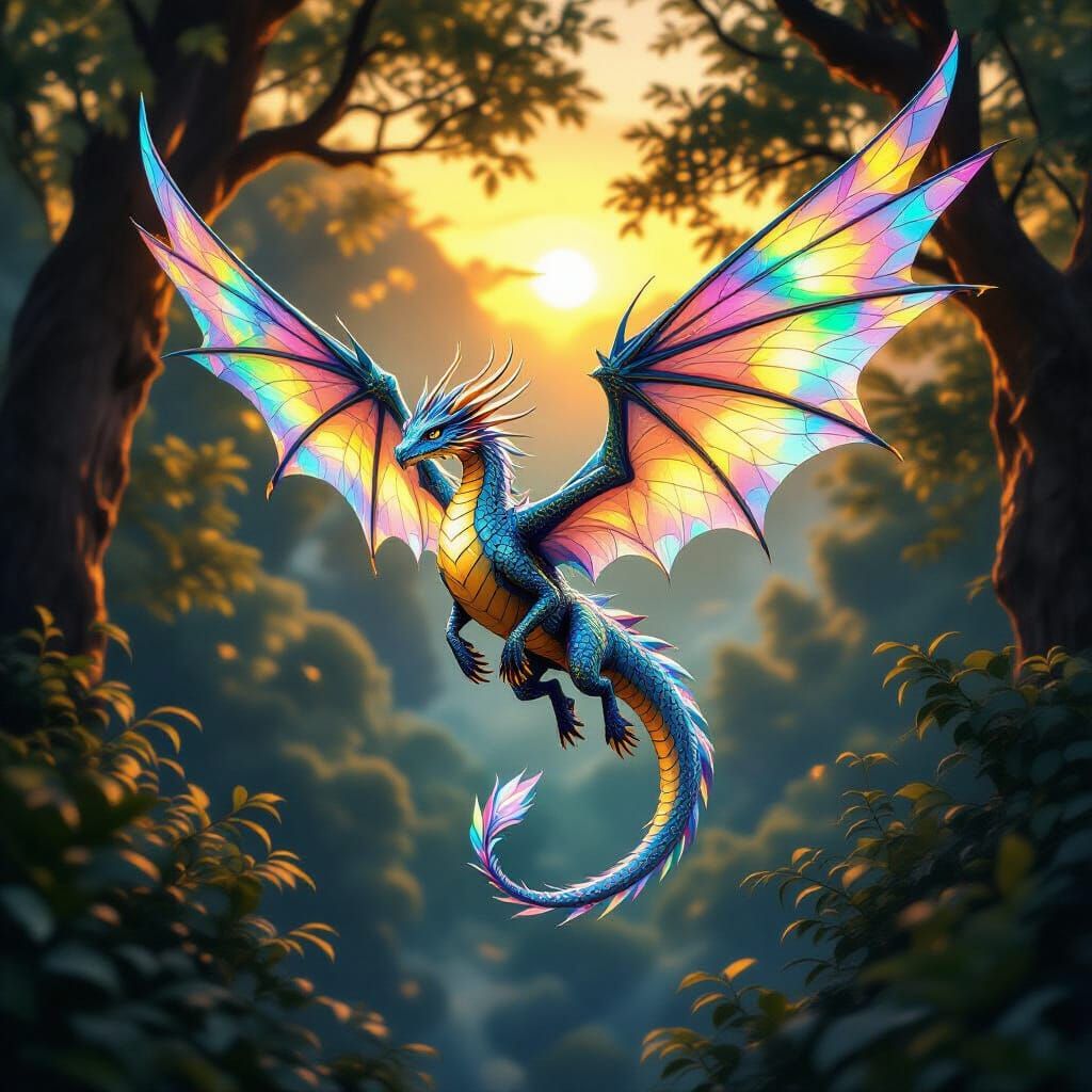 A stunning image of a crystal dragon soaring over an enchanted forest at sunset. Iridescent wings reflect rainbow colors, with hyperrealistic details and magical brilliance, rendered in Unreal Engine 5.