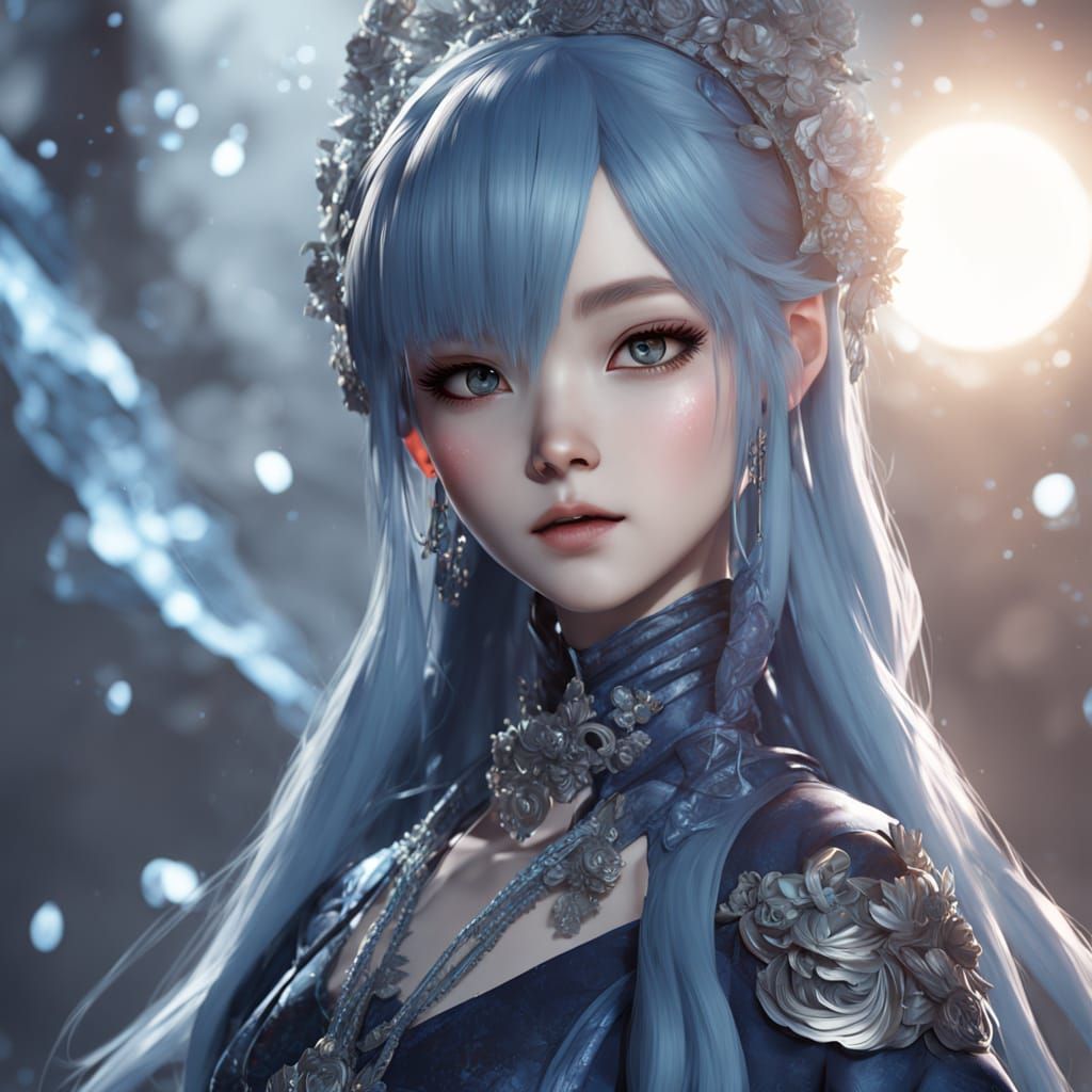 This 3D anime art features a Roblox avatar with dark blue hair in a ponytail, wearing a shimmering dress. The scene is set against a serene moonlit ocean, rendered with moody blue and silver lighting for a breathtaking effect.