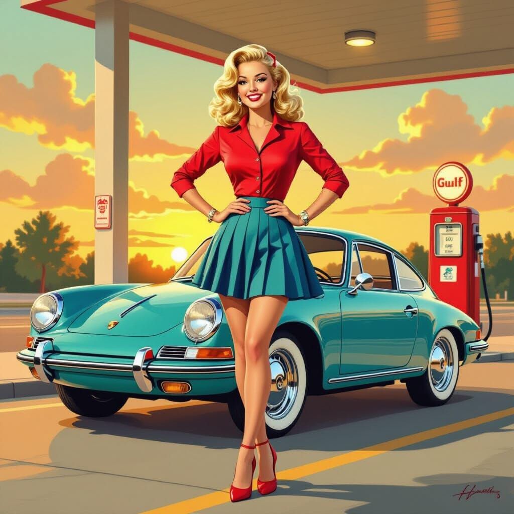 This image shows a blonde pin-up girl in retro attire posing next to a vintage Porsche at a Gulf gas station. Bathed in sunset light, the art evokes a 1950s American pin-up aesthetic with hand-painted, vector-style finish.