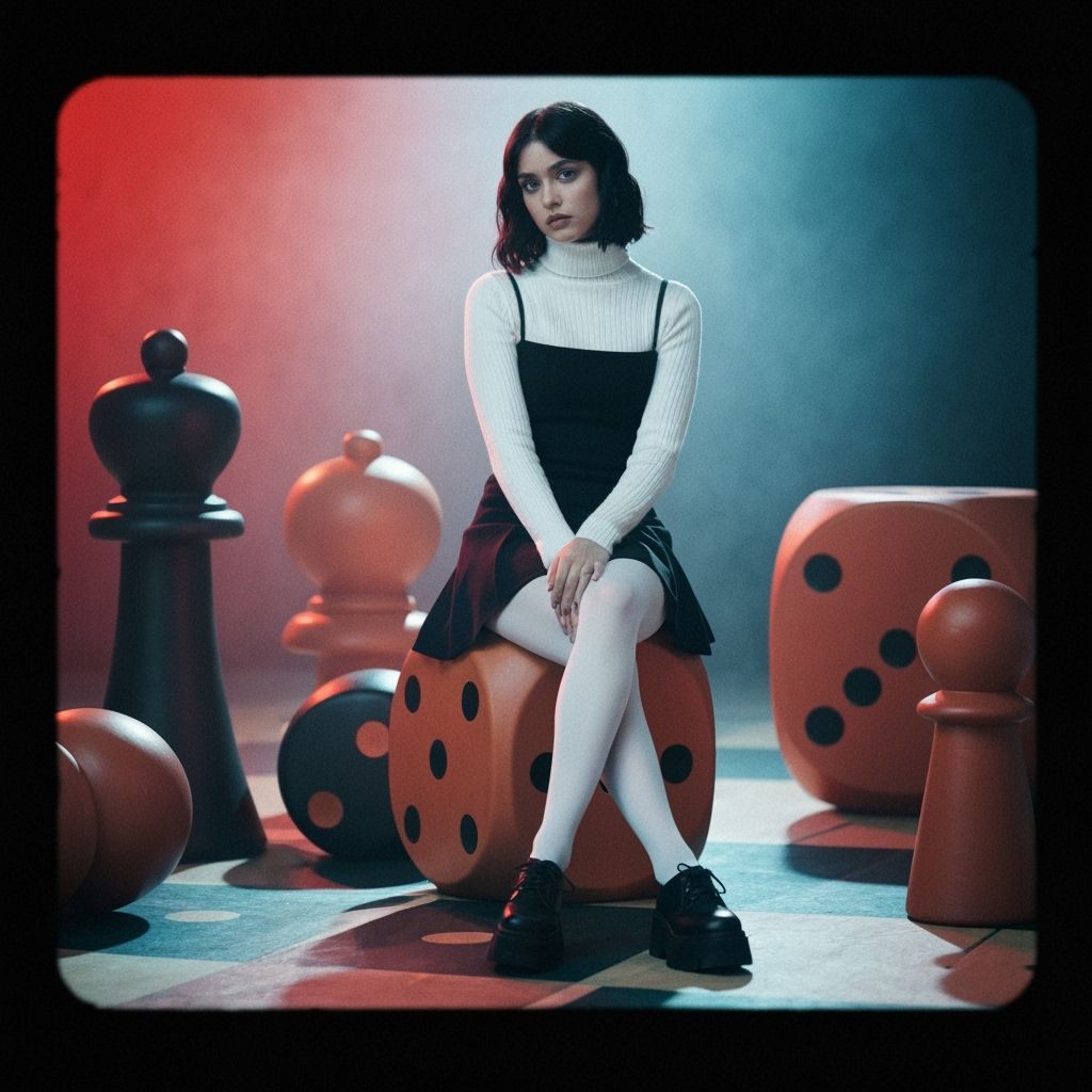 This image shows a dark-haired woman in a white turtleneck and black dress, seated on dice. Giant board game pieces surround her, with cinematic lighting and cool color grading, in a filmic style.