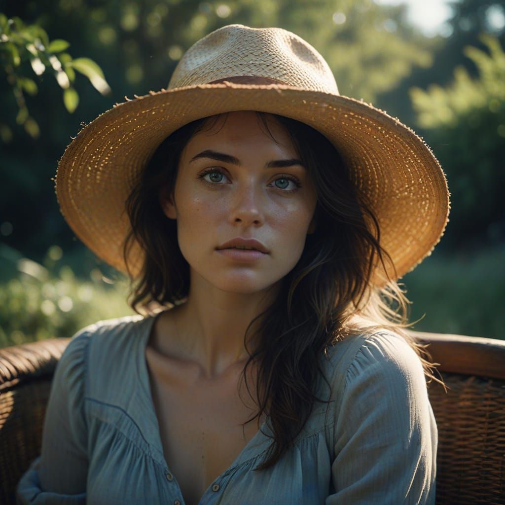 A serene and peaceful cinematic film still captures a young woman taking a break from writing, lost in thought as warm golden hour light shines down, emphasizing earthy tones and deep blues in a masterpiece of atmospheric lighting