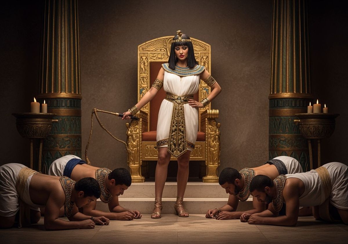 This image shows a powerful Egyptian queen in a gold toga, towering over servants in her throne room. The scene is captured with sharp focus, natural lighting, and a shallow depth of field.