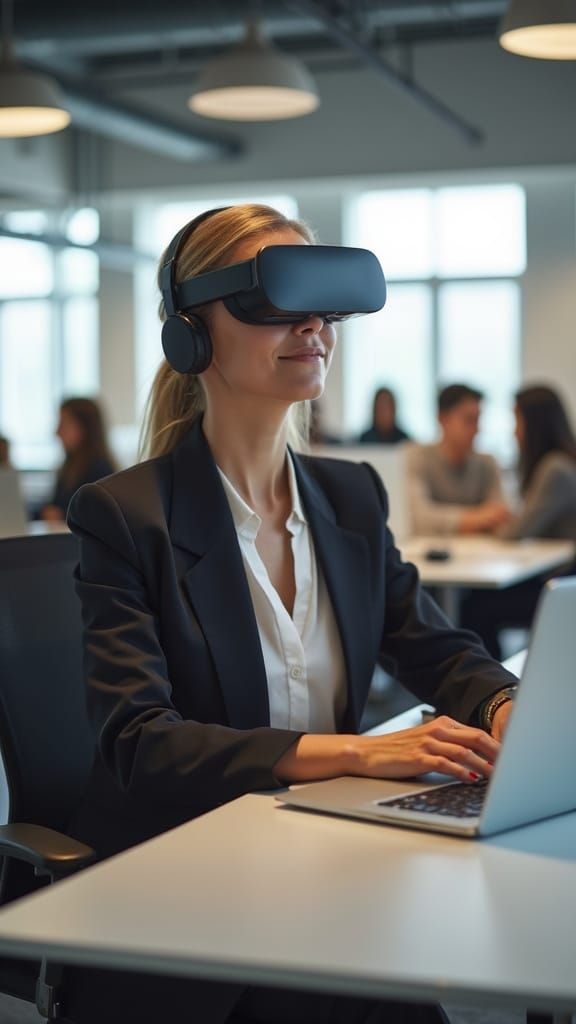 This image shows a woman in business attire using a VR headset in a modern office. Coworkers collaborate nearby in a scene reminiscent of corporate portraiture, with a subtle tech startup ambiance.
