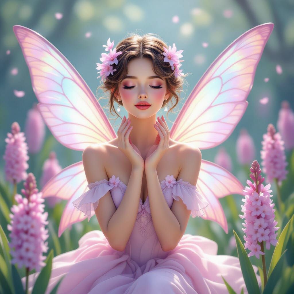 A striking picture of a hyacinth fairy listening to nature. She has iridescent pink wings and wears a pink dress. This digital painting captures a bioluminescent figure with vibrant colors and intricate details.