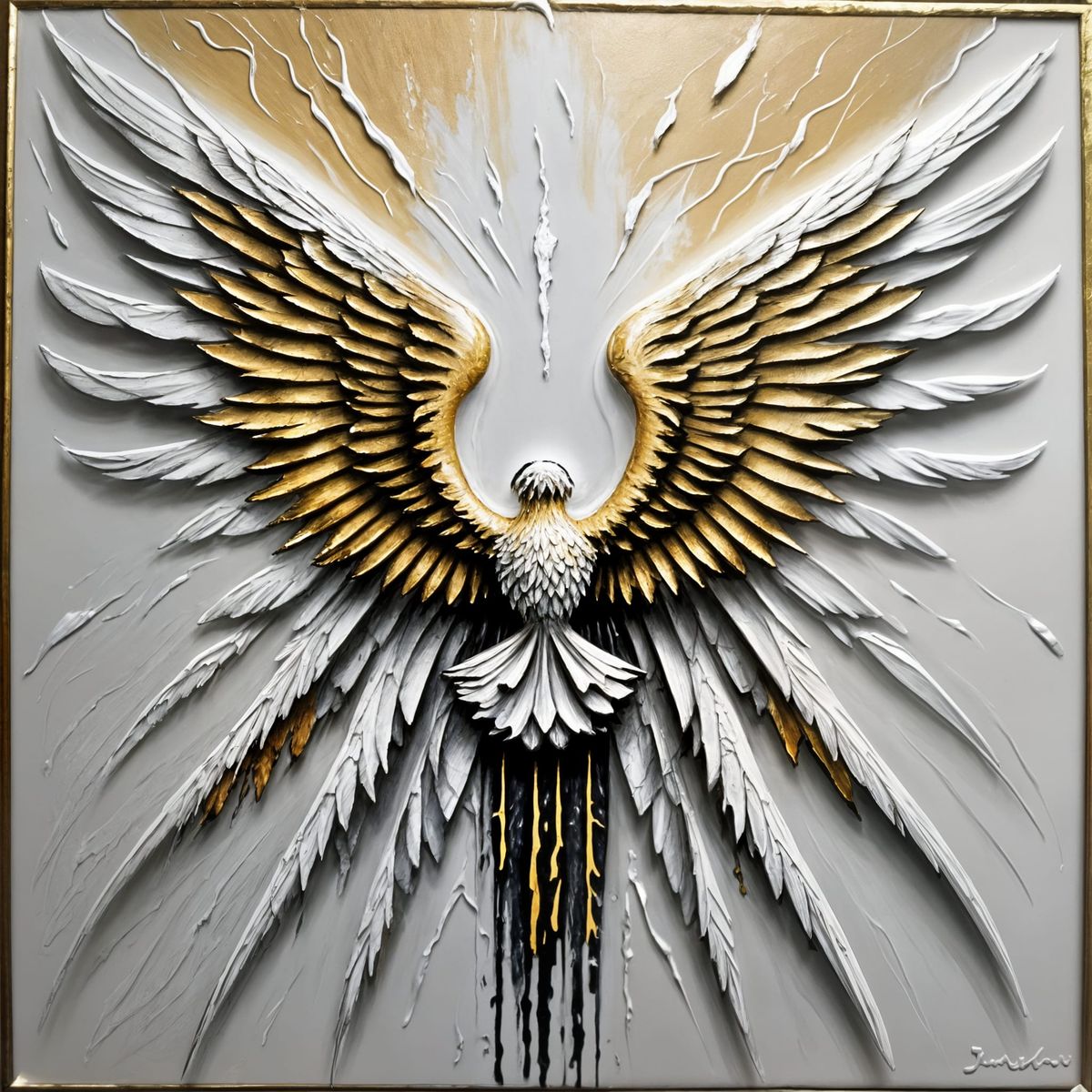 This image is a vibrant expressionist oil painting featuring angelic wings emerging from chaos, with thick textured brushstrokes and a semi-abstract composition.