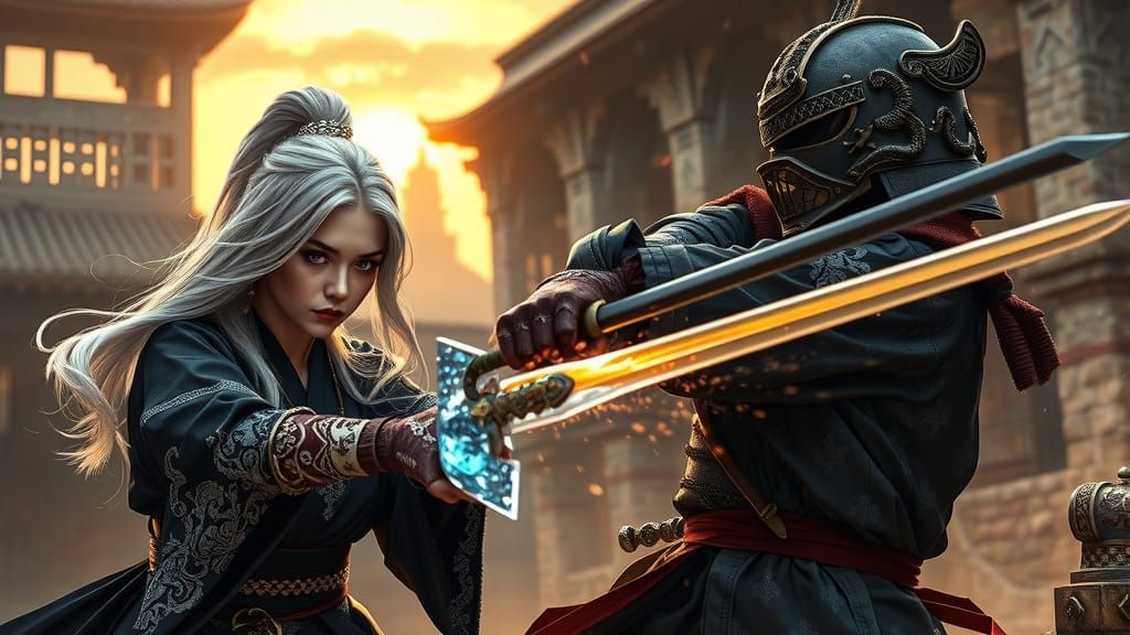 A serene yet intense duel unfolds between a silver-haired samurai and a masked warrior amidst the warm glow of a sunset in ancient Japanese castle ruins, with sparks flying and chiaroscuro lighting creating a cinematic high fantasy atmosphere