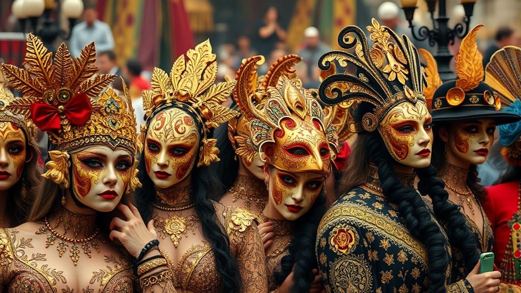 A vibrant festival scene with people in elaborate, gold-adorned costumes and masks, inspired by Art Nouveau and Gustav Klimt's opulent style.