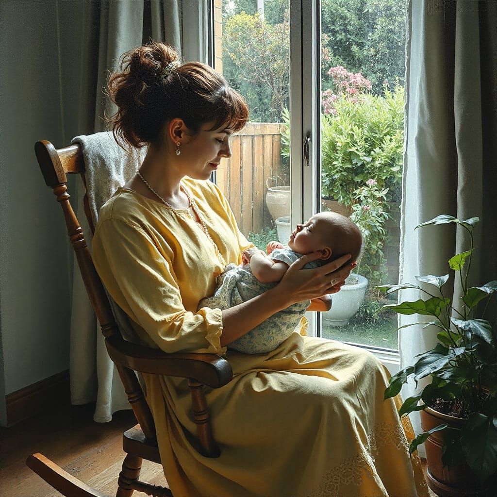 This image shows a mother nursing a baby while sitting in a rocking chair near a window. The neo-impressionistic style oil painting features thick layers of colorful, textured paint with silver and pearl accents.