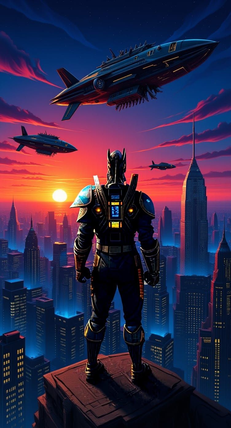 A lone female warrior in detailed armor surveys a vast, glowing Art Deco city at dusk. Colossal spacecraft loom against a vibrant alien sunset, rendered in a concept art style.