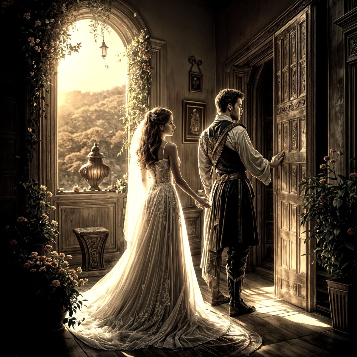 This image shows a red-headed bride in an elegant dress, standing in a doorway. The scene is a detailed matte painting with deep, complementary colors, reminiscent of fantasy concept art in 8k resolution.