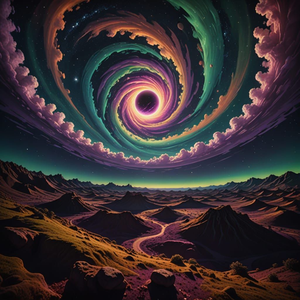 This striking film still captures a swirling vortex of colors and lights in space, with stars and galaxies in the background, evoking the surrealism of M.C. Escher and the vibrant colors of a Pink Floyd music video, with deep blues and purples in the shadows and warm golden light in the distance.