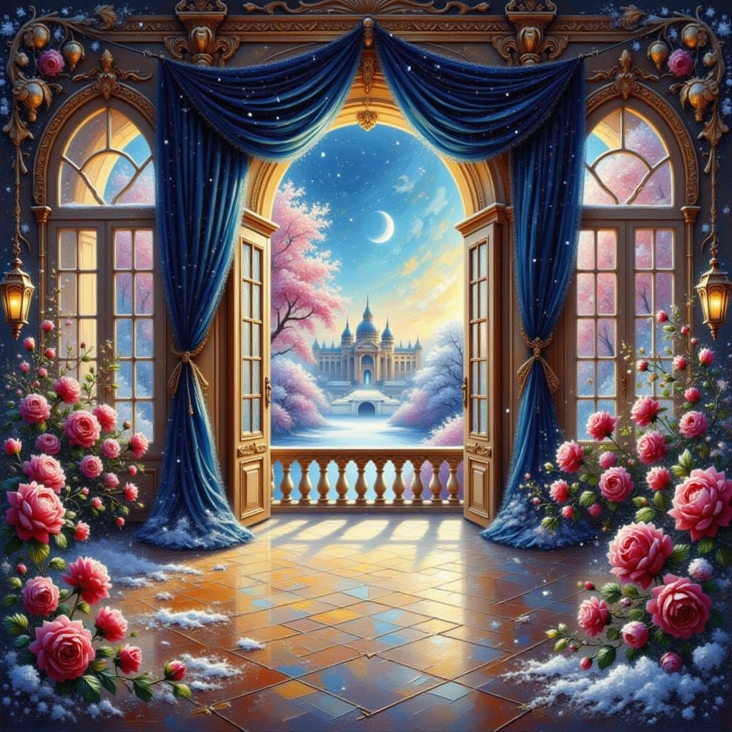 This image depicts a grand, empty ballroom with gilded arches and velvet curtains, opening onto a stone balcony overlooking a winter garden. Soft golden light illuminates the scene, creating a magical and peaceful atmosphere with a distant palace under a starry sky.