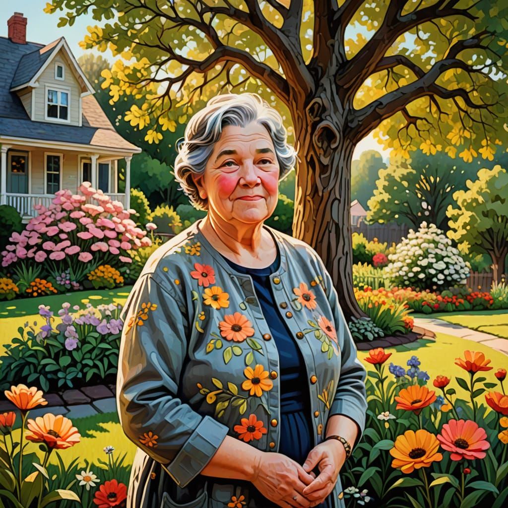 This image depicts a serene and comforting scene of a grandmotherly woman standing beside an oak tree in her front yard, surrounded by colorful garden flowers and warm afternoon sunlight.