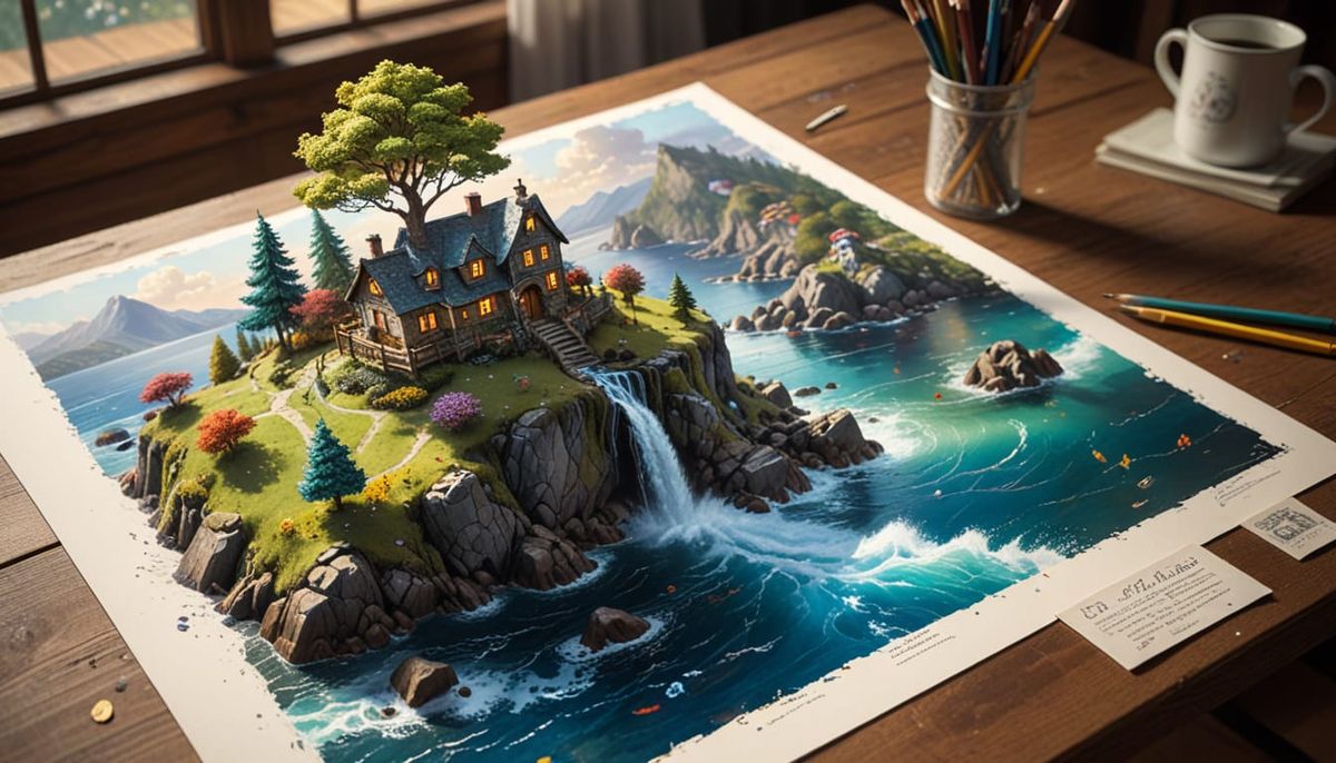 This image shows a close-up of a pencil on drawing paper, creating a 3D mossy space. The paper depicts a deer by a lake, rendered in a fantasy style with vibrant colors and high detail.