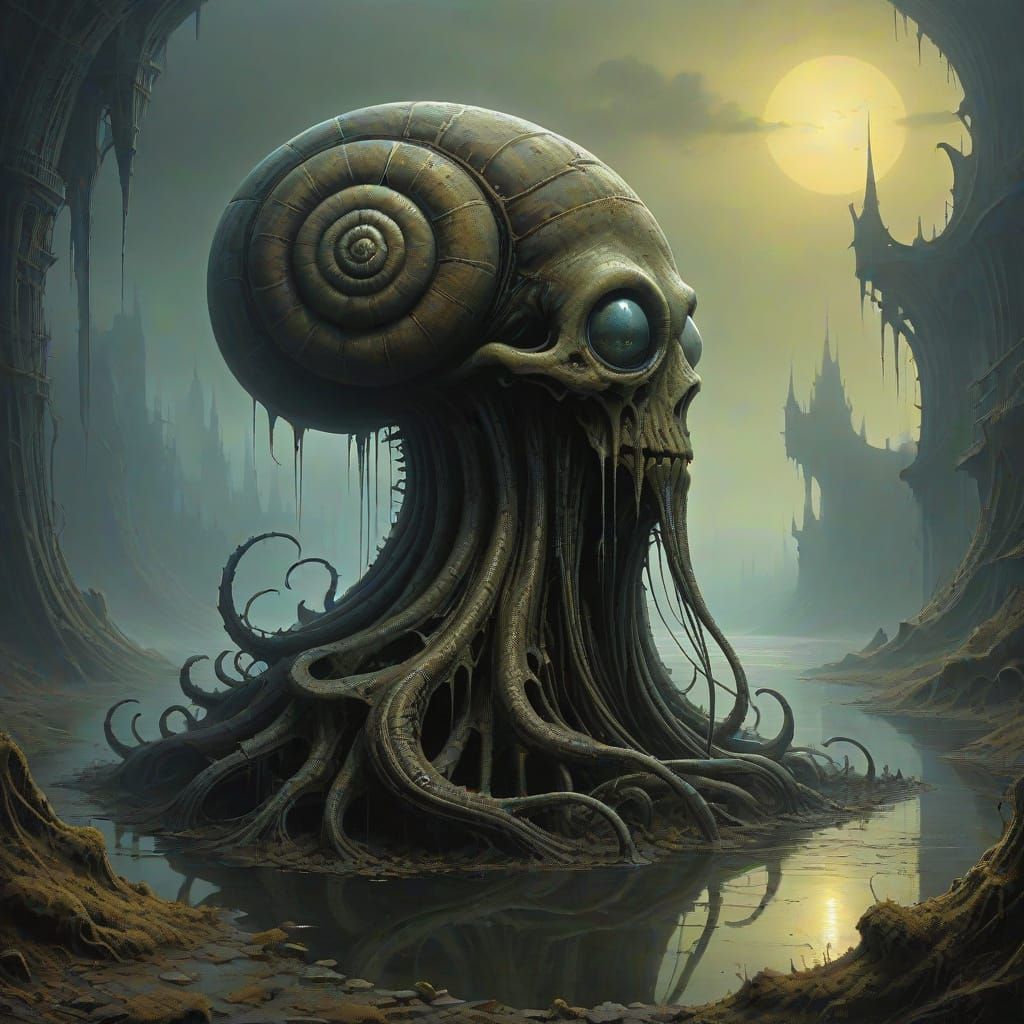 This image shows a giant purple snail with sharp black spines and shimmering yellow slime. Its large eyes observe its surroundings near a tranquil pond. The style blends organic, biomechanical horror, and techno-organic structures.