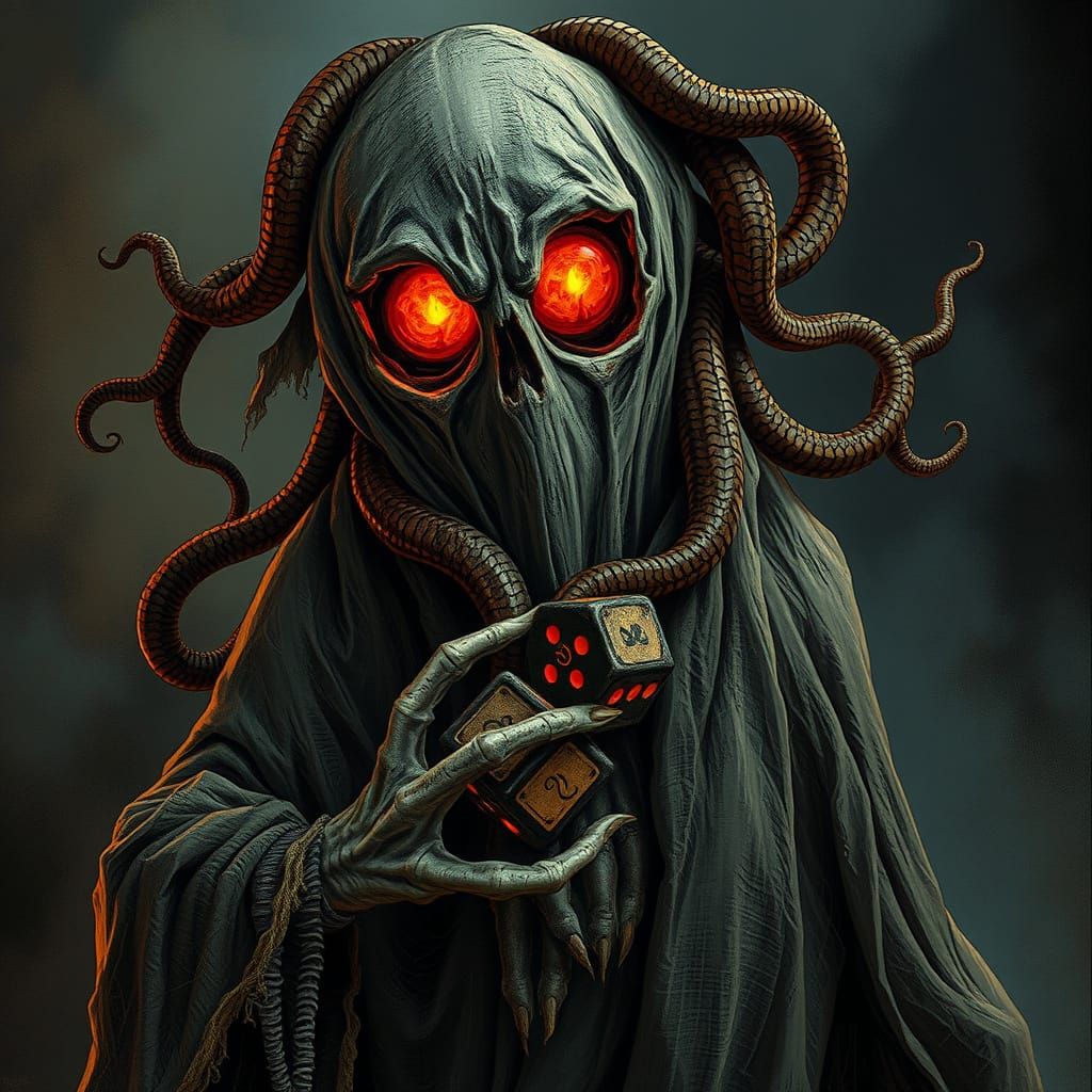 This haunting image depicts a ghostly figure with a tattered, brown burlap sack body, intricately detailed with frayed threads and worn textures. Its eyes glow with an eerie, red luminescence, surrounded by snakes with deep, rich brown scales and beady eyes. The ghost holds worn, ancient dice with myster...