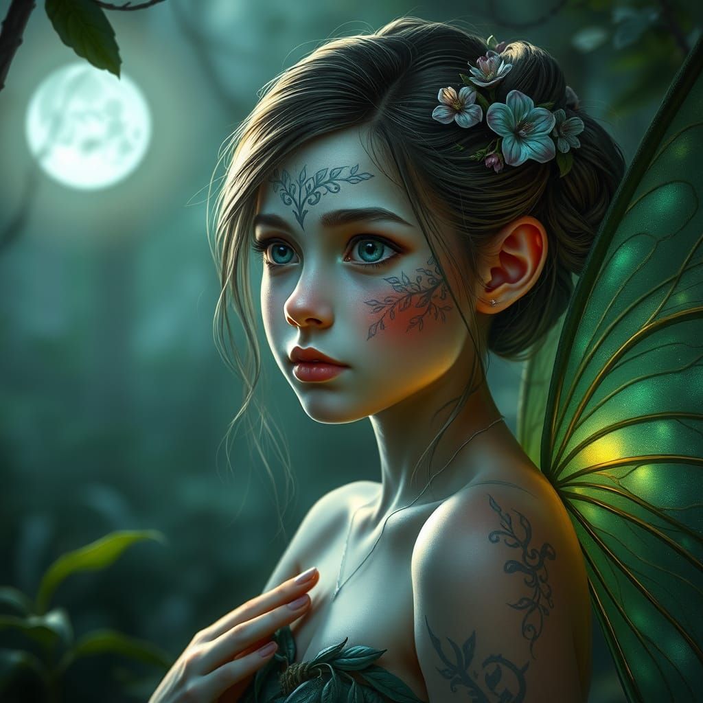 This image shows a hyperrealistic digital painting of a forest fairy with delicate floral facial tattoos and shimmering bioluminescent wings. Bathed in ethereal moonlight, the scene features a mystical, dreamlike atmosphere and a deep color palette.