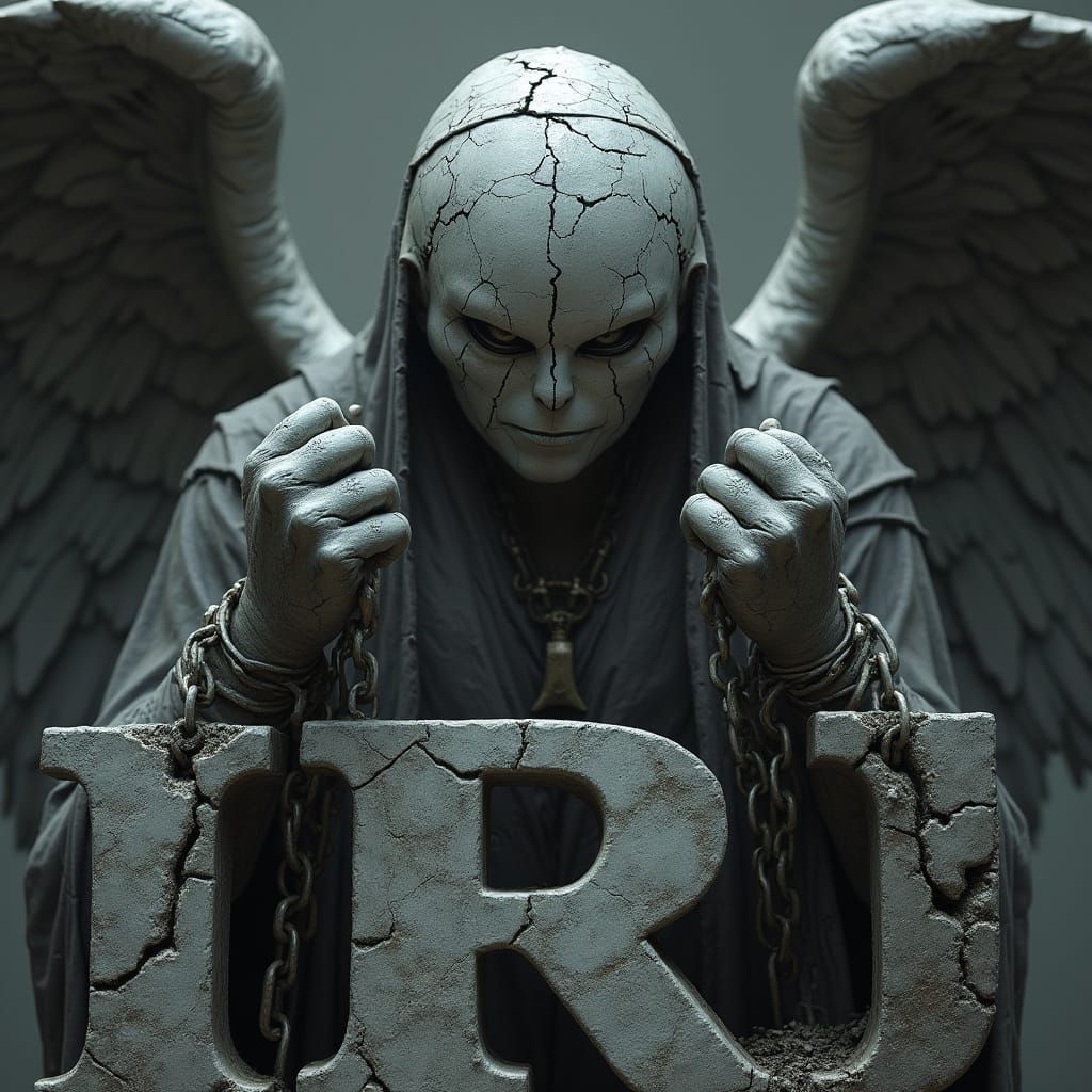 A dramatic image of a faceless angel with a cracked porcelain mask. The figure wears tattered robes and broken chains, posed against weathered stone letters with biomechanical, high-contrast and mystical elements.