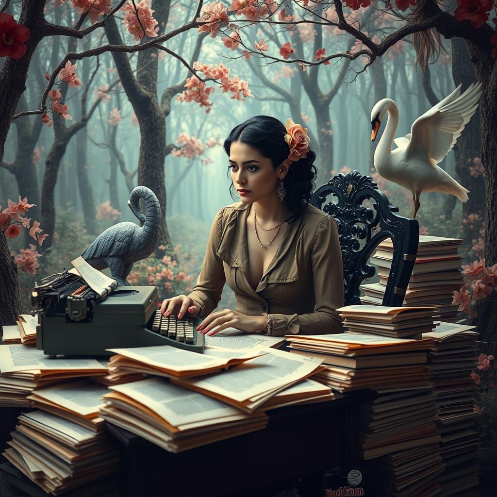 This image shows a woman at a typewriter in a surreal forest setting. The scene features pastel and vibrant colors, intricate patterns, and textures reminiscent of surrealist art.