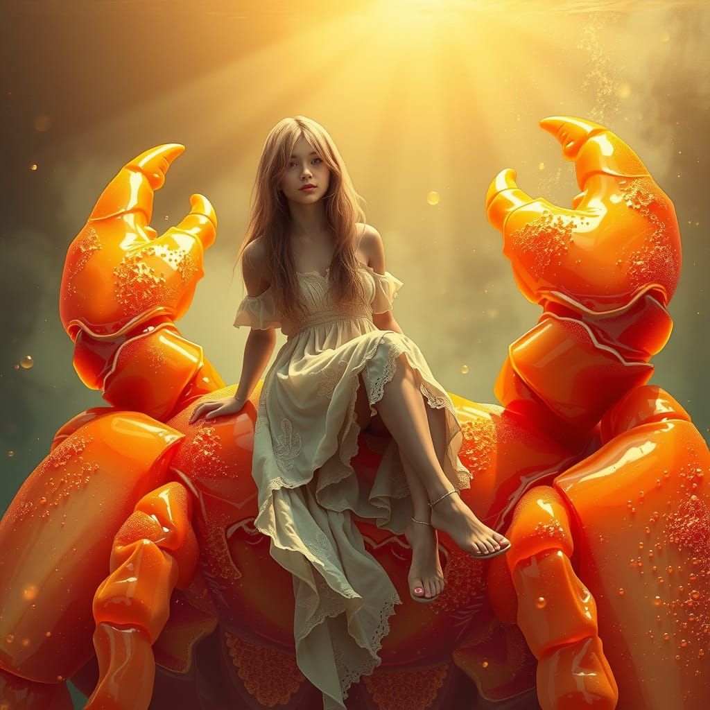 A digital artwork of a woman with golden hair sitting on a gummy crab. The fantasy scene features a sea of soda in warm golden and bronze tones, with a futuristic neon glow and delicate linework.