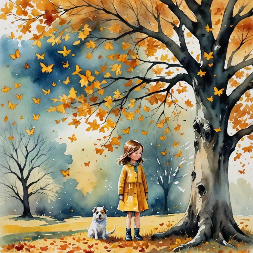 This image shows a young girl and her dog beneath an autumn tree. Rendered as a watercolor painting, the artwork features yellow butterflies and the gentle movement of the autumn wind.