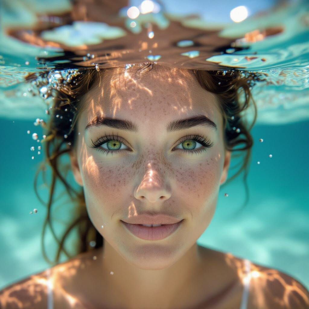 A woman with striking green eyes and freckles floats peacefully underwater, her hair swaying in gentle currents. Sunlight filters through rippling waves, creating a serene and captivating scene.