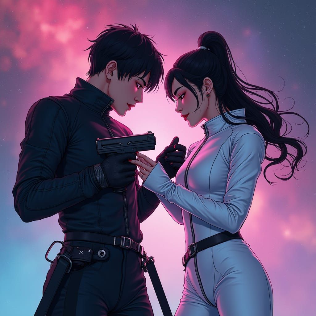 This image shows two futuristic assassins engaged in playful sparring against a backdrop of a vibrant galaxy. The artwork features digital painting techniques and a neon-infused cyberpunk aesthetic.