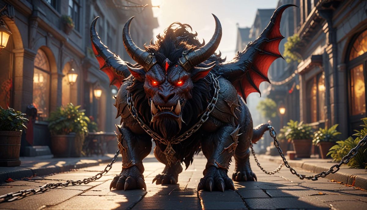 This image shows a colossal demon lord gently leading a small, fluffy, horned demonic pet along a vibrant sidewalk. The scene is bathed in warm, golden light with dynamic shadows, rendered as hyper-realistic digital art.