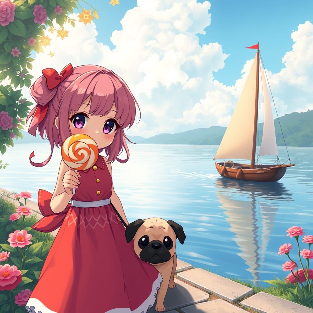 This image shows a vibrant anime girl in a red dress, holding a colorful lollipop and walking a playful pug on a leash, amidst a beautiful sailboat and serene natural scenery, reminiscent of Studio Ghibli's whimsical style.