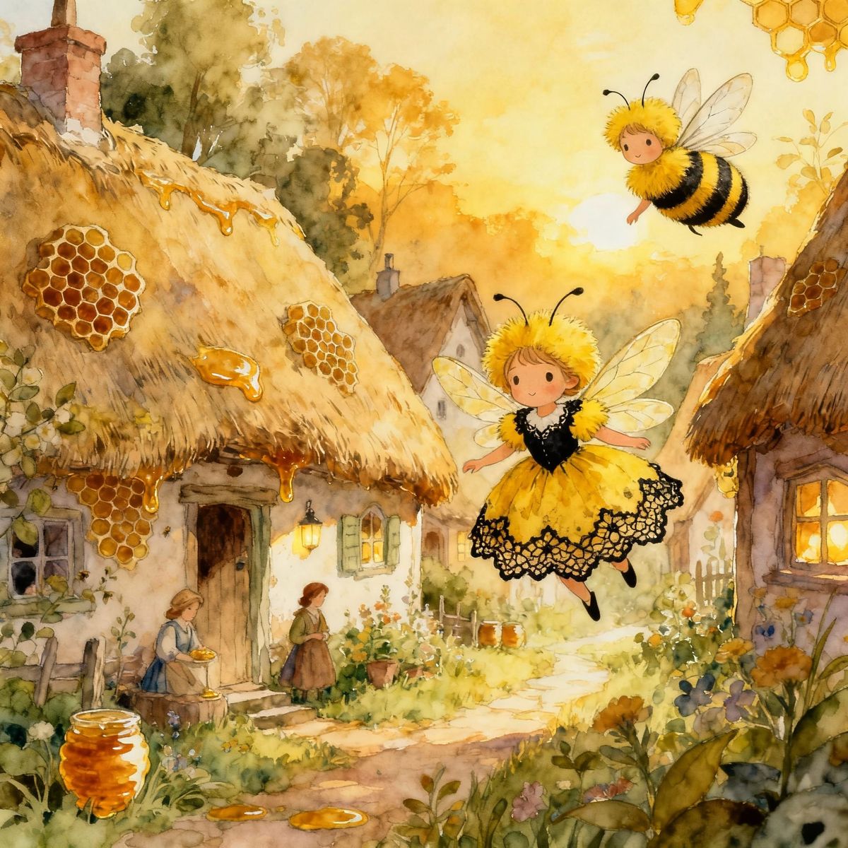 This image shows cute bee fairies with human faces and lace dresses in a whimsical village. Rendered in a charming watercolor style with soft brushstrokes and vibrant colors.