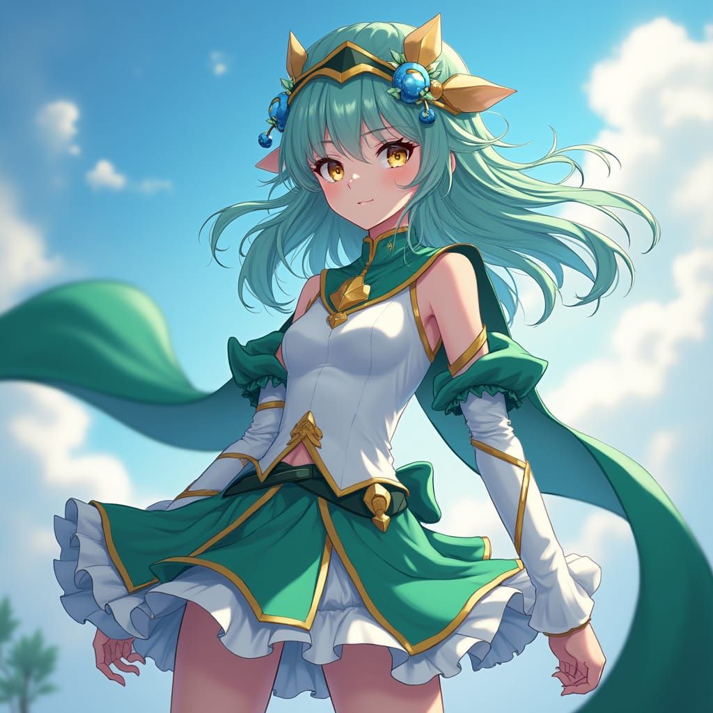 This image shows a cel-shaded girl in a white, green, and blue fantasy outfit. The heroic figure stands with cinematic lighting and deep colors, in a manga-inspired aesthetic.
