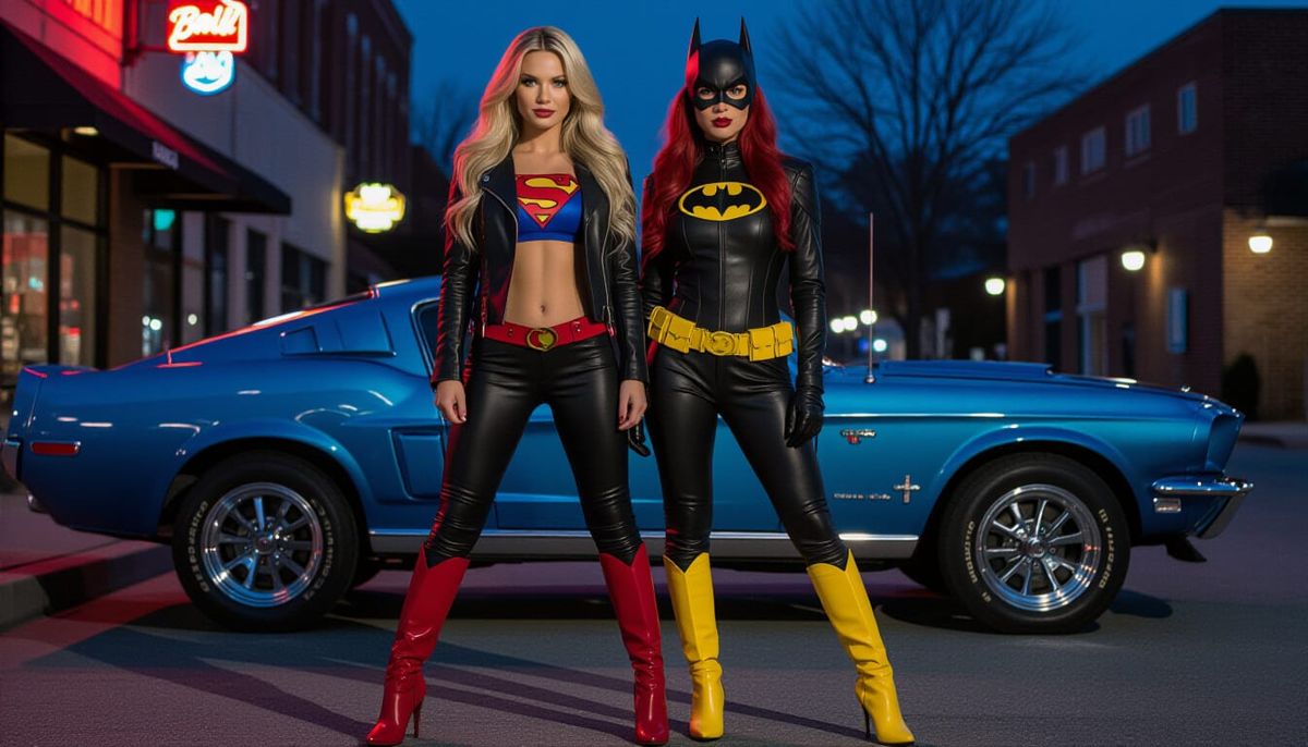 This image shows Supergirl and Batgirl reimagined as biker babes in a dynamic comic book style. The characters are depicted outside a bar with classic sports cars in a vibrant, high-quality Bronze Age comic aesthetic.
