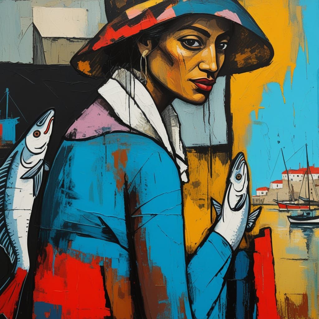 A striking portrait of a coastal woman in vivid tones of turquoise, ochre, and crimson. She holds fish close, embodying labor, longing, and maritime life. The geometric stylization merges realism and abstraction, evoking dignity within hardship.