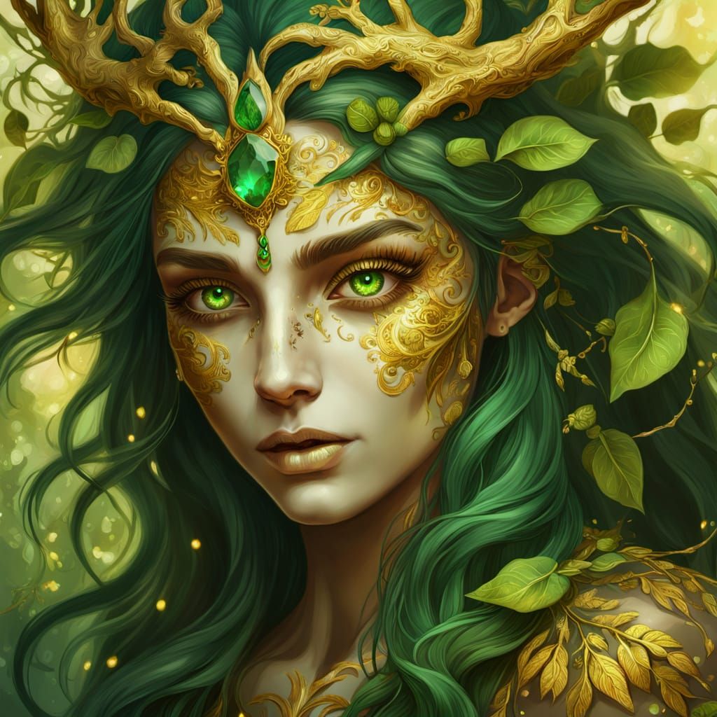 This image shows a close-up of a dryad with striking emerald eyes and intricate golden tattoos covering her body. It's rendered in a vibrant oil painting style with soft, ethereal lighting.