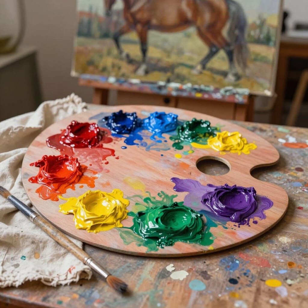 This image shows a photorealistic oil painting of an artist's palette with vibrant paints, a brush, and a stained rag. The background features an easel with a horse painting, illuminated by natural studio light.