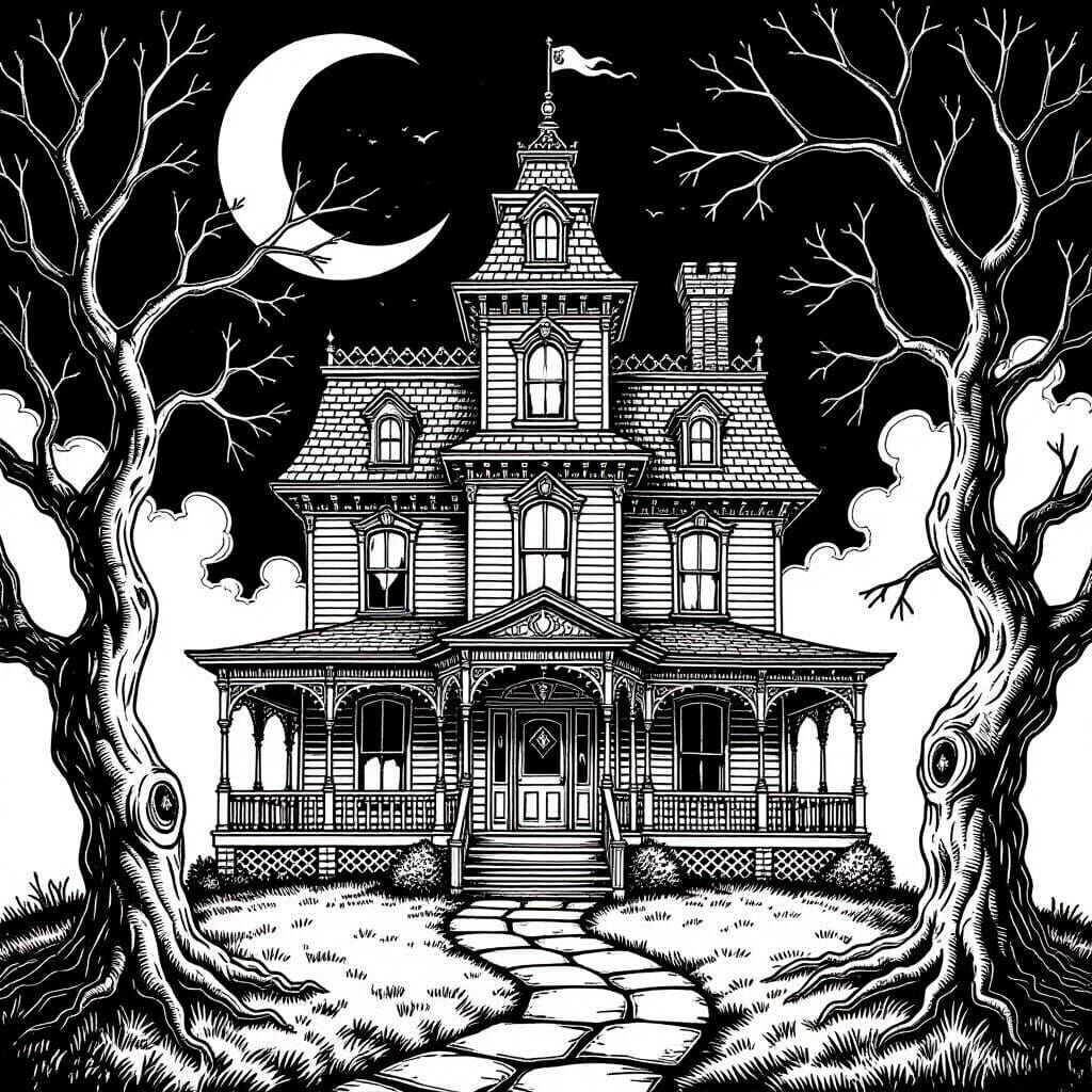This image is a detailed black and white line drawing of a haunted house, featuring gnarled trees, a moon, and fog, inspired by gothic architectural etchings.