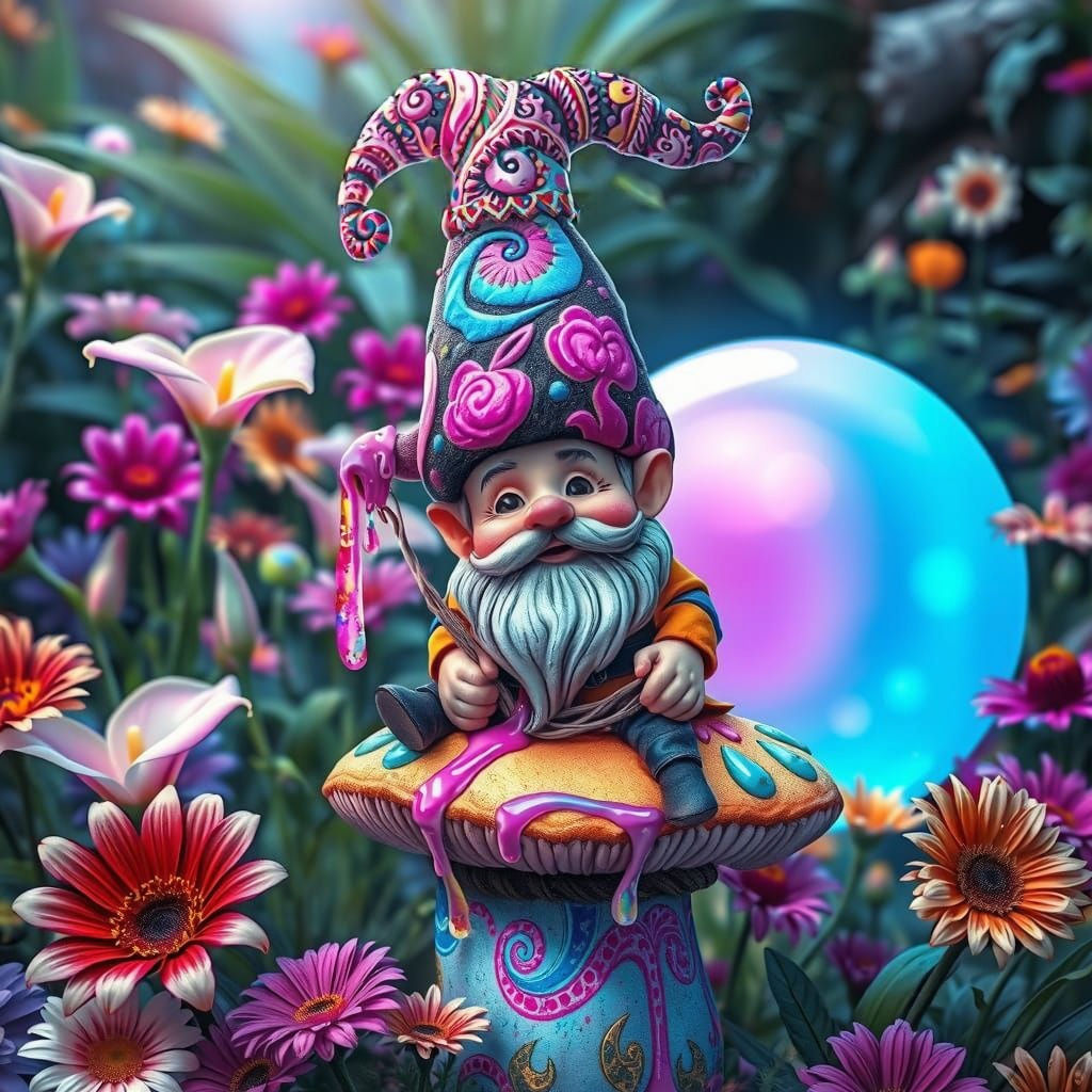 This psychedelic image features a serene garden gnome sitting on a glowing toadstool with swirling patterns and long, shimmering paint drips, surrounded by lush flowers in a hyperdetailed, 8k resolution style reminiscent of fantastical, dreamlike art.